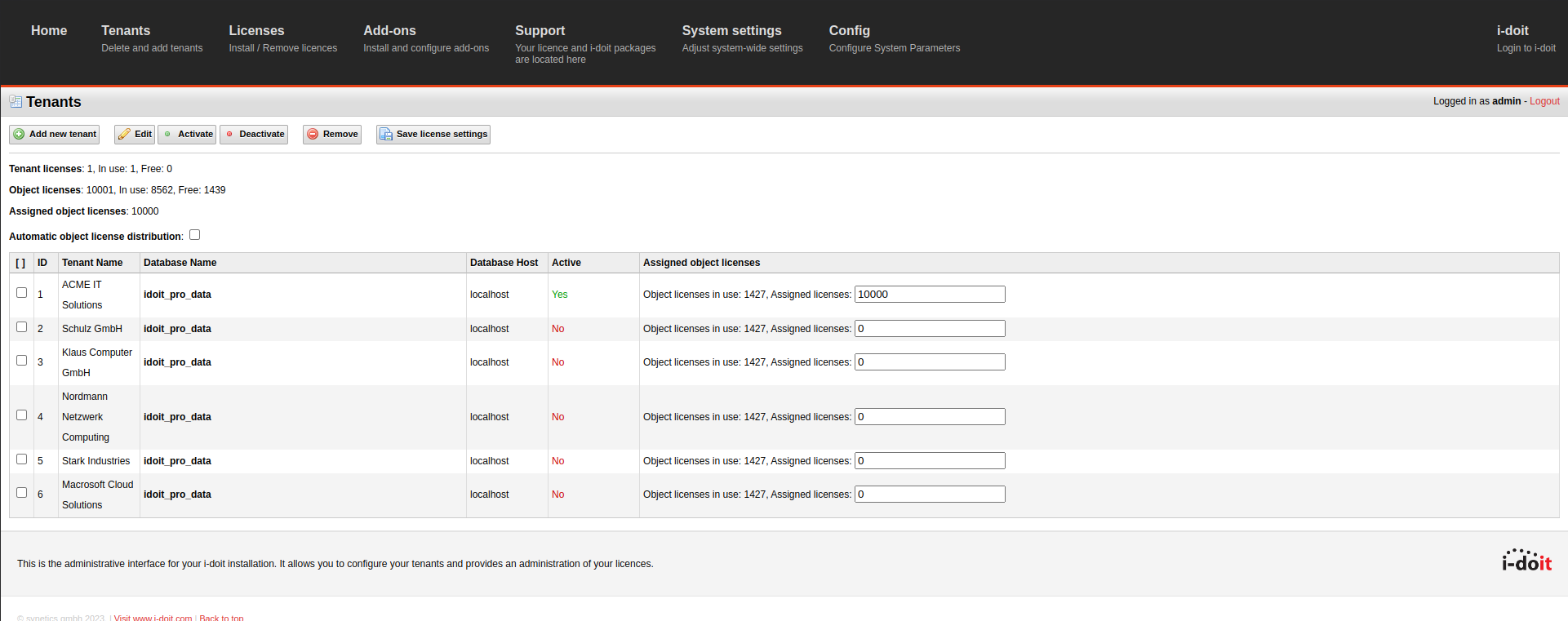 Im Bereich Tenants werden die Mandanten verwaltet. Dies wird allerdings nur bei einer Multi-Mandanten-Lizenz von i-doit relevant. Neue Mandanten können über die Schaltfläche "Add new tenant" erzeugt werden. Bestehende Mandanten können außerdem bearbeitet, (de)aktiviert oder vollständig gelöscht werden. Ein gelöschter Mandant kann nur über ein BackUp wiederhergestellt werden.