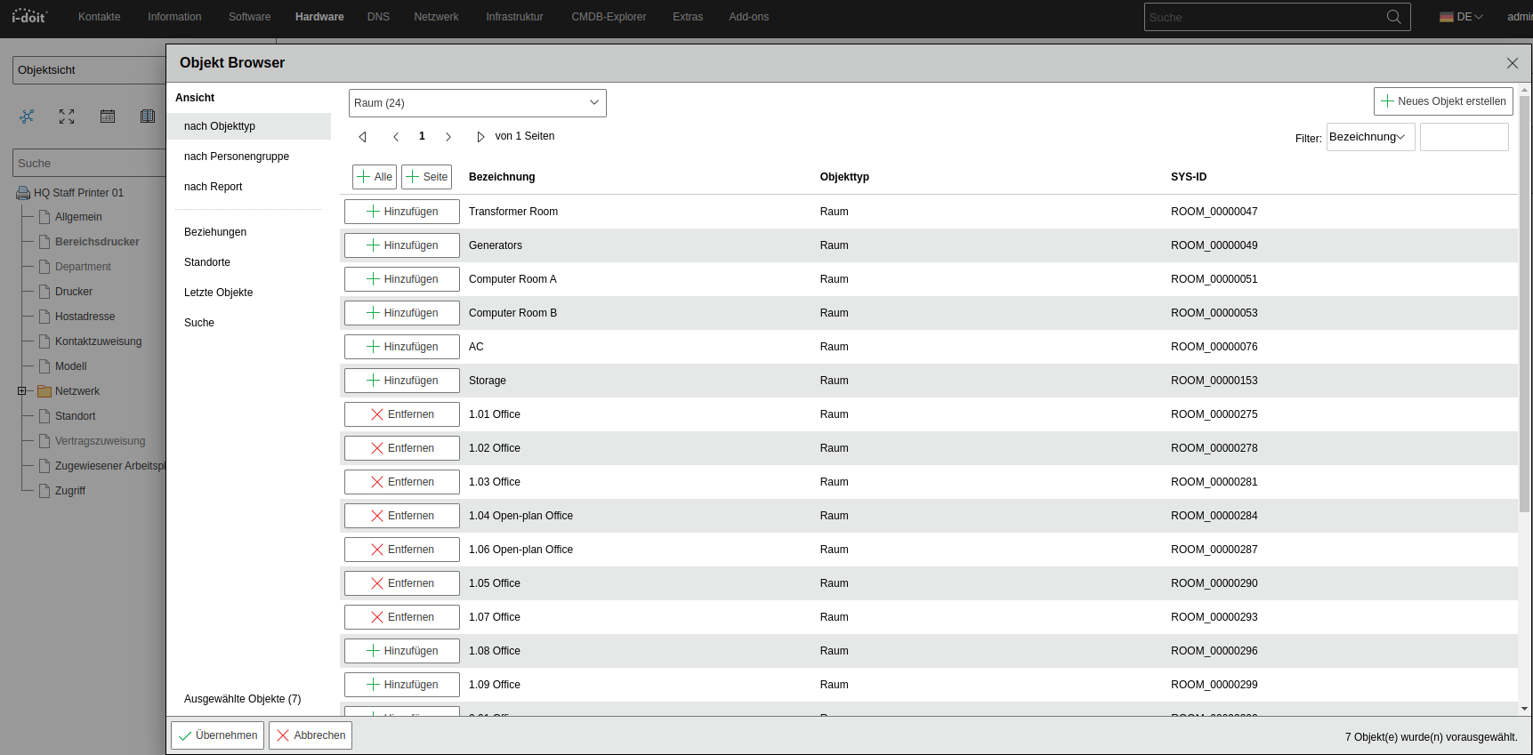 Danach wechselt man zum Objekt HQ Staff Printer 01. In der Kategorie Bereichsdrucker wählt man nun in die zugeordneten Räume aus.