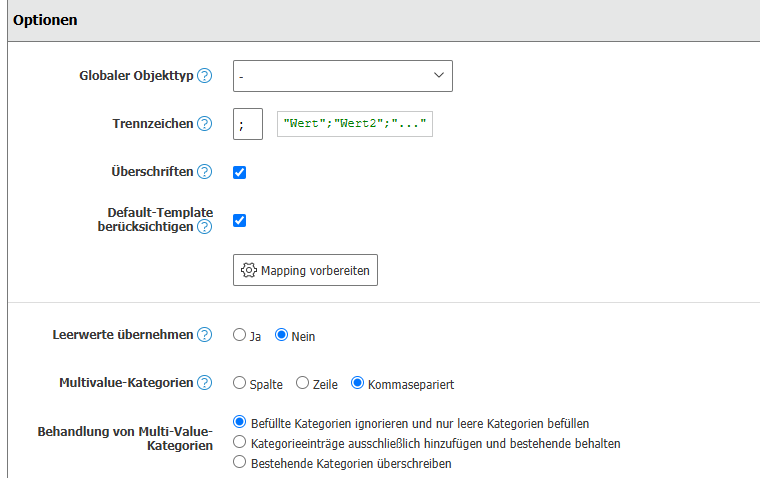 Für den Import begeben wir uns wieder in den CSV Import Bereich. Die Multivalue-Kategorien setzen wir auf Kommasepariert.