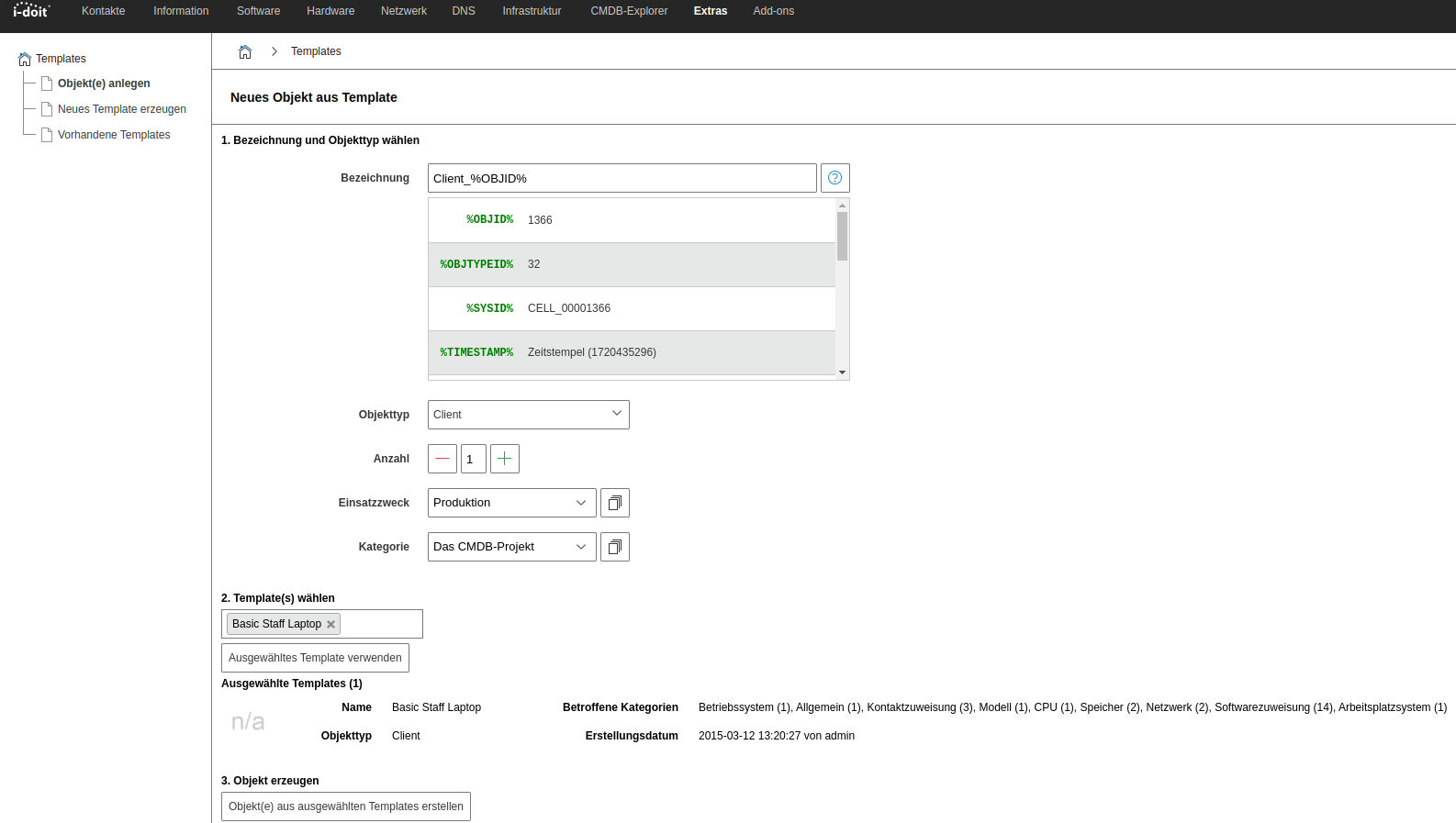 Du findest die Template-Funktion in i-doit unter Extras → Templates. Hier ist es möglich vorhandene Templates einzusehen und zu bearbeiten, neue Templates anzulegen und Objekte aus Templates zu erzeugen.