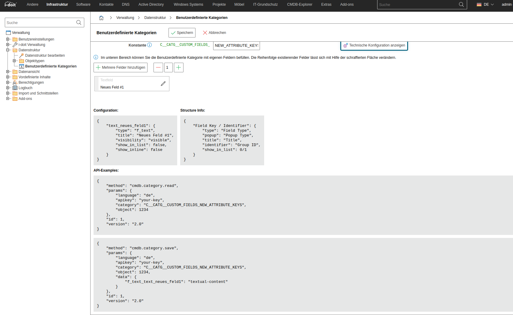 Neben den Standard-Kategorien in i-doit können eigene (benutzerdefinierte) Kategorien erstellt werden, um zusätzliche Attribute zu dokumentieren, die in den Standard-Kategorien nicht enthalten sind.