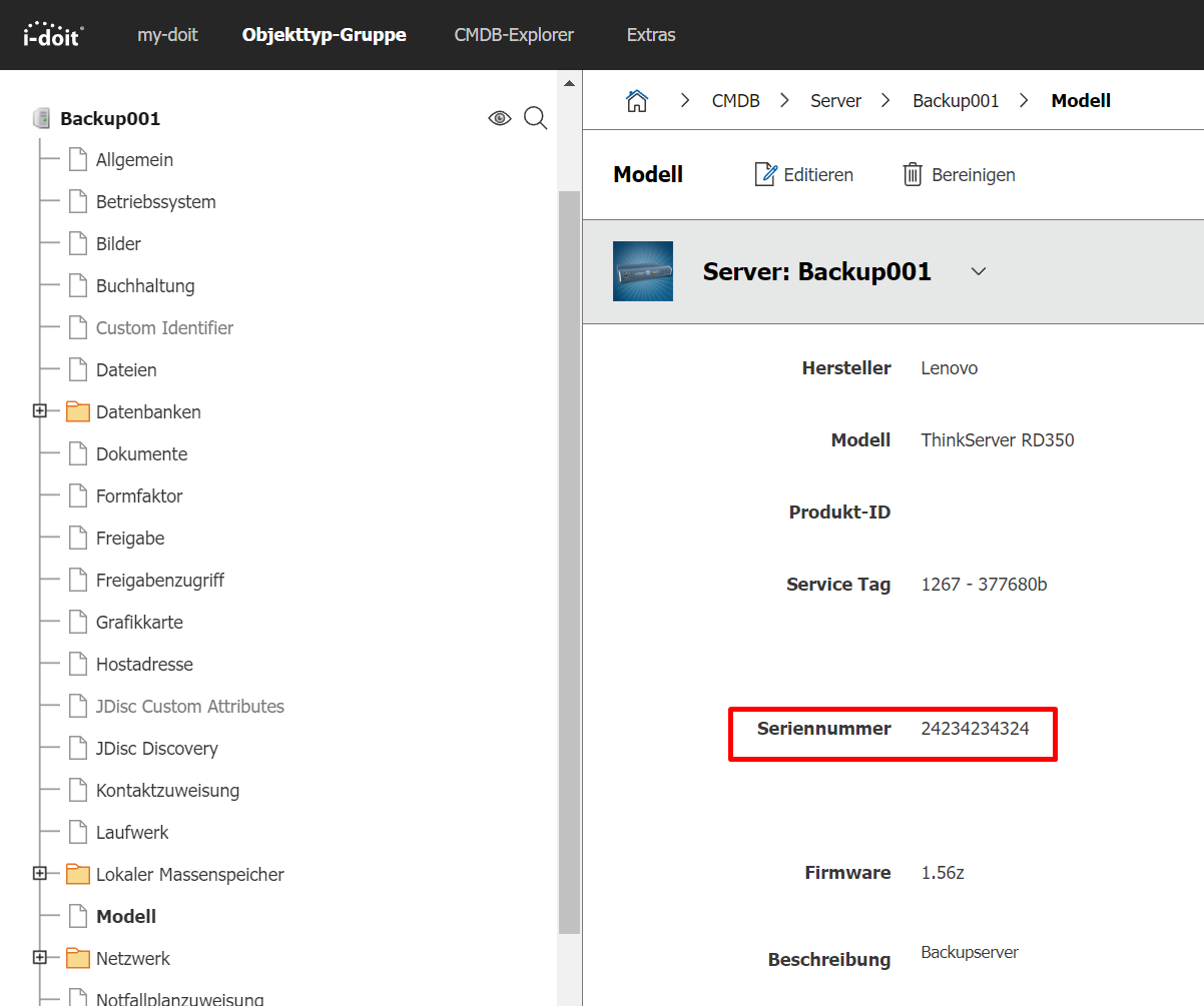 Ein Attribut ist ein dokumentierter Wert zu einem Objekt. Gleichartige Attribute werden in i-doit zu Kategorien zusammengefasst. Beispiel: in der Kategorie "Modell" das Attribut "Seriennummer".