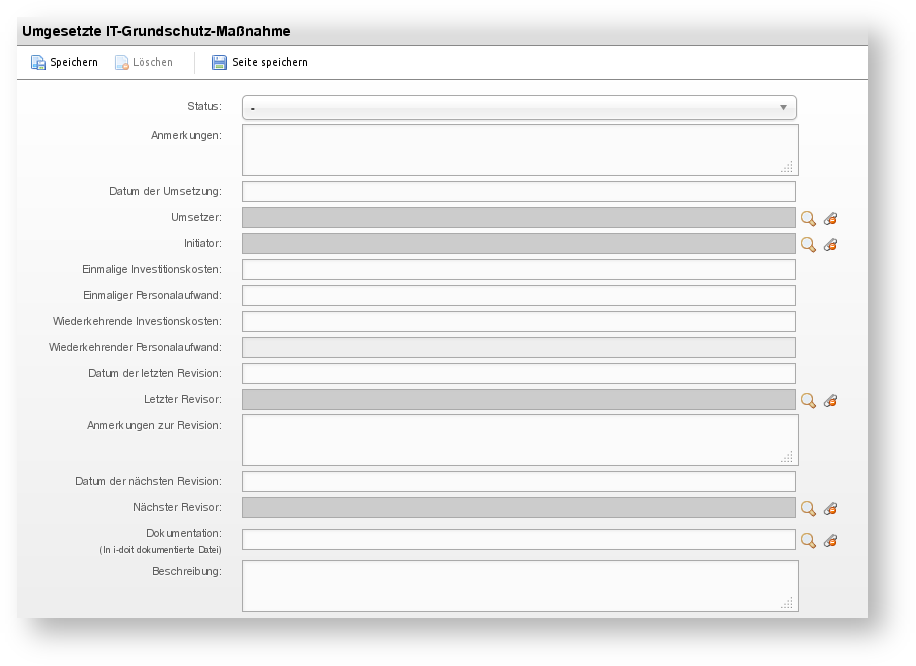 Bei einem Klick auf eine verknüpfte Maßnahme unterhalb von einem einer Zielgruppe zugeordneten Baustein, kann der Status ihrer Umsetzung im Detail dokumentiert werden.