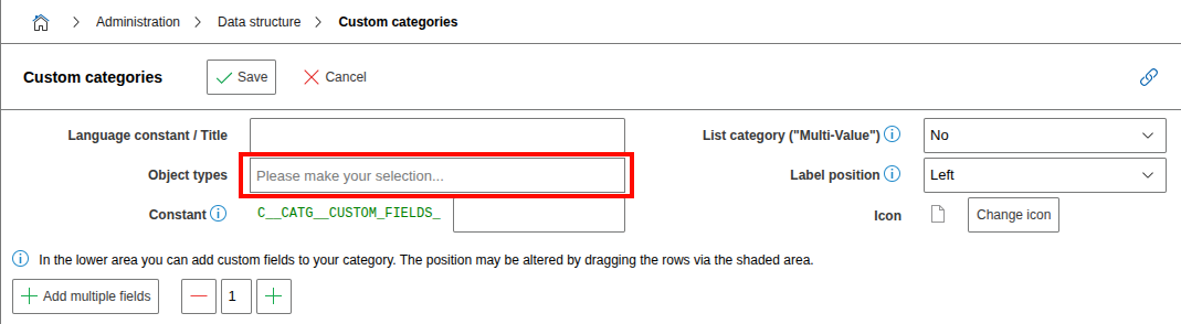 As soon as your category is configured and set up, you can use the Save button in order to make the category available in the chosen object types.
