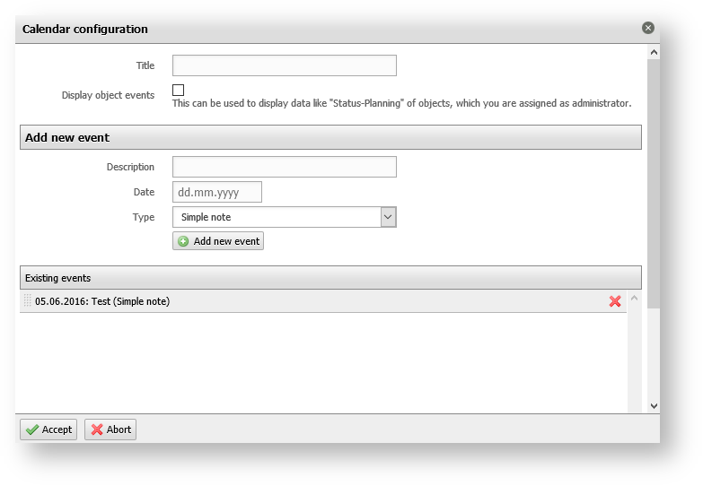 The calendar widget marks fixed dates or events in bold letters. For this purpose, a check has to be set via the pencil so that object dates, such as the status planning, are considered. It is mandatory to have the role of "administrator" for that particular object with a planned status, so that the calendar entry will be shown.