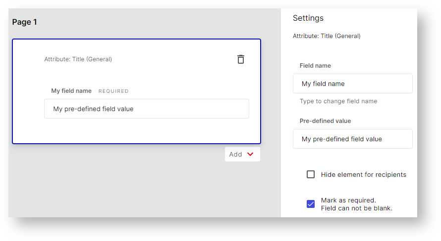 The Field name can be changed for the element. In addition, a Pre-defined value can be stored, this value is then pre-filled.