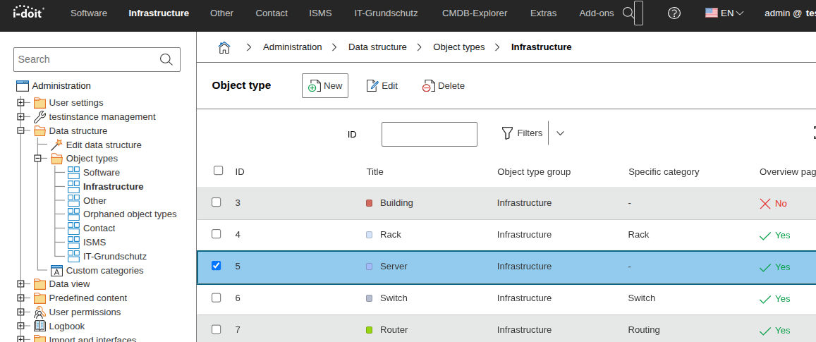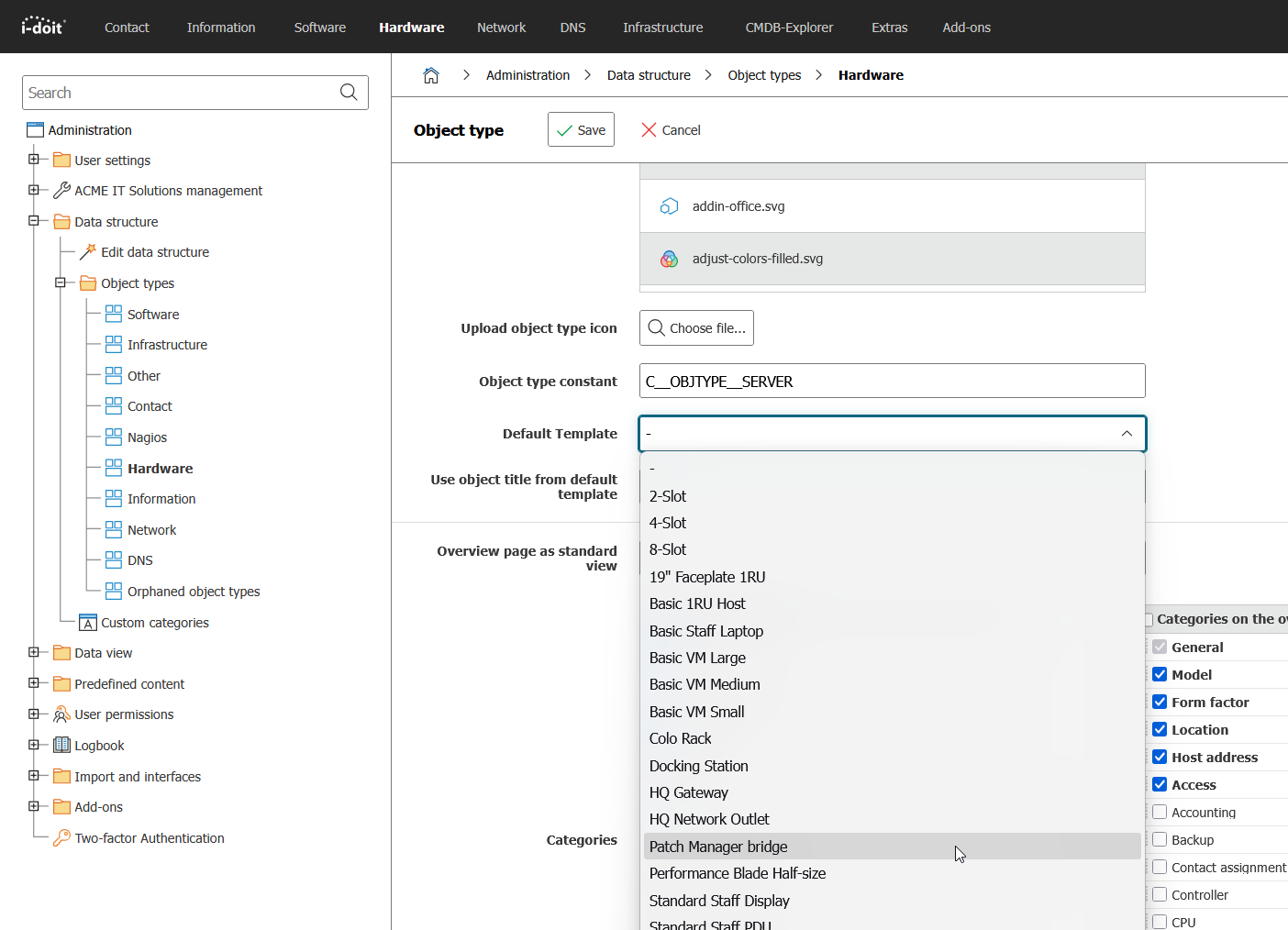 Click your profile icon in the upper right corner and select "Administration". Then go to "Data structure" / "Object types" / "Hardware" and select "Server".