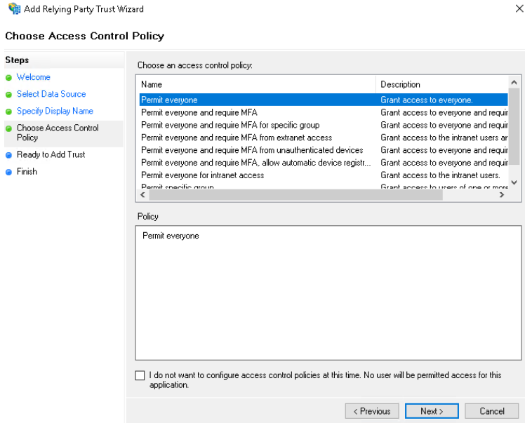 In the next step we can control accesses, for the sake of simplicity we leave it at Permit everyone for now.